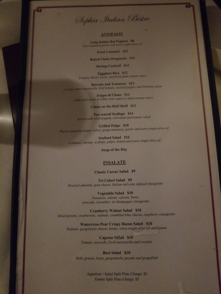 Sophia Italian Bistro in Amityville, NY offers a range of Italian cuisine in a romantic and classy setting. With options for vegetarians, the menu features tasty antipasti like Baked Clams Oreganata and Fried Calamari, flavorful pasta dishes like Linguine Fradiavolo and Lobster Ravioli, and fresh salads such as Caprese and Tri Colori. Customers rave about the generous portions and delicious flavors, with reviews praising the attentive service and cozy atmosphere. Whether you're on a chilled date or dining with friends, Sophia Italian Bistro promises a memorable dining experience with its excellent food and welcoming ambiance. The combination of great food, excellent service, and a charming atmosphere make Sophia Italian Bistro a must-visit for Italian cuisine lovers.